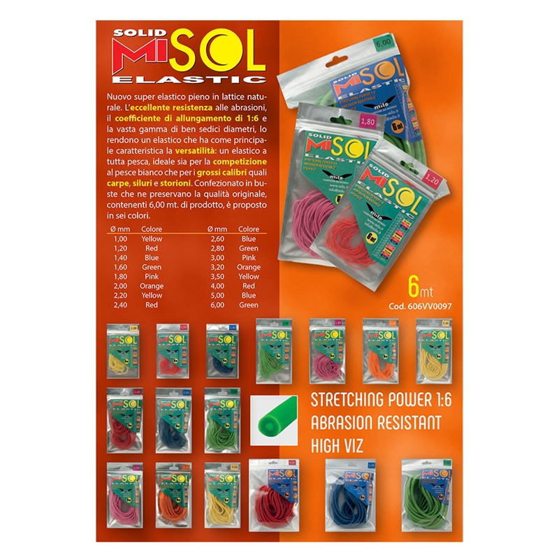 Super elastico pieno in lattice naturale. Leccellente resistenza alle abrasioni, il coefficiente di allungamento di 1:6 e la vasta gamma di ben 17 diametri, lo rendono un elastico che ha come principale caratteristica la versatilità: un elastico a tutta pesca, ideale sia per la competizione al pesce bianco che per i grossi calibri quali carpe, siluri e storioni. Confezionato in buste che ne preservano la qualità originale, contenenti 6,00 mt. di prodotto, è proposto in sei colori.