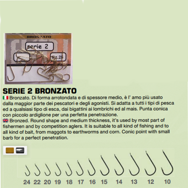 Bronzato. Di forma arrotondata e di spessore medio, è l’ amo più usato  dalla maggior parte dei pescatori e degli agonisti. Si adatta a tutti i tipi di pesca  ed a qualsiasi tipo di esca, dai bigattini ai lombrichi ed al mais. Punta conica  con piccolo ardiglione per una perfetta penetrazione. UNO DEGLI AMI PIU' APPREZZATI NEL MONDO DELL'AGONISMO ITALIANO.  25pz per Busta