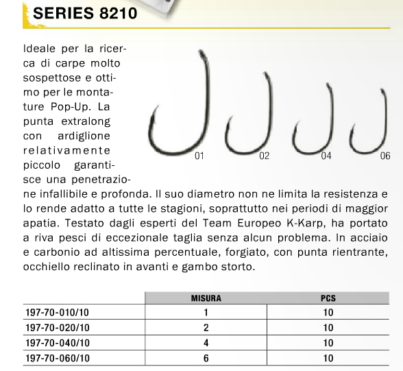 netrazione infallibile e profonda. Grazie al diametro maggiorato questo amo puo’ sopportare combattimenti al limite con prede da record, oltre i 30 chili. Testato dagli esperti del Team Europeo K-Karp ha portato a riva pesci di eccezionale taglia senza alcun problema. In acciaio e carbonio ad altissima percentuale, forgiato, con punta rientrante, occhiello in avanti e gambo storto.