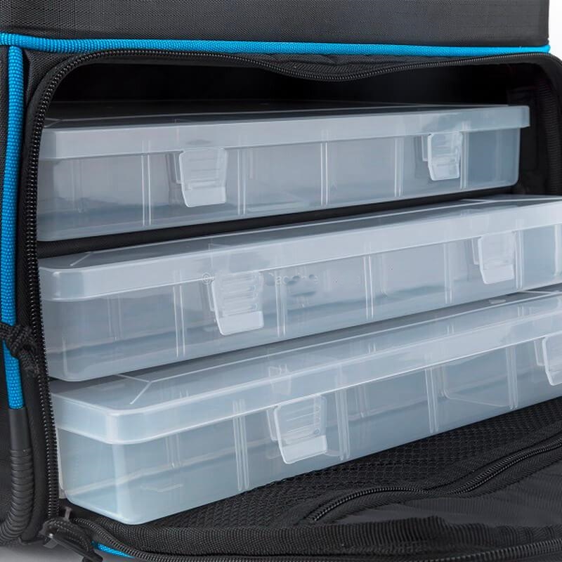 Lo zaino da surf ha un'enorme capacità di stoccaggio e può ospitare un'ampia gamma di attrezzature. Fornito con 3 scatole in plastica in cui stivare tutta la minuteria, situate in uno scomparto inferiore con apertura a ribalta ad accesso rapido, l'ampio scomparto principale è in grado di ospitare molte altre attrezzature e sono presenti tasche laterali e anteriori con chiusura a cerniera per un ulteriore stoccaggio. Un'utile borsa termica staccabile, con rivestimento termico riflettente, si collega alla parte superiore dello zaino Surf. Realizzato in tessuto di nylon rip-stop di alta qualità, con rinforzi strategici in PVC per una maggiore resistenza, lo Shimano Surf Rucksack offre uno spazio versatile per un'ampia gamma di articoli per l'attrezzatura. Con finiture facili da pulire, Power Stitch a doppia resistenza, cerniere e tirazip sovradimensionati per la massima durata e clip e fibbie per impieghi gravosi, è dotata di una tracolla imbottita e di una maniglia separata per un facile trasporto.