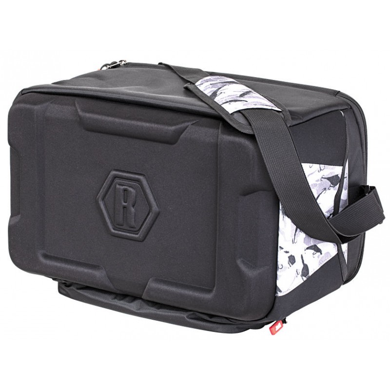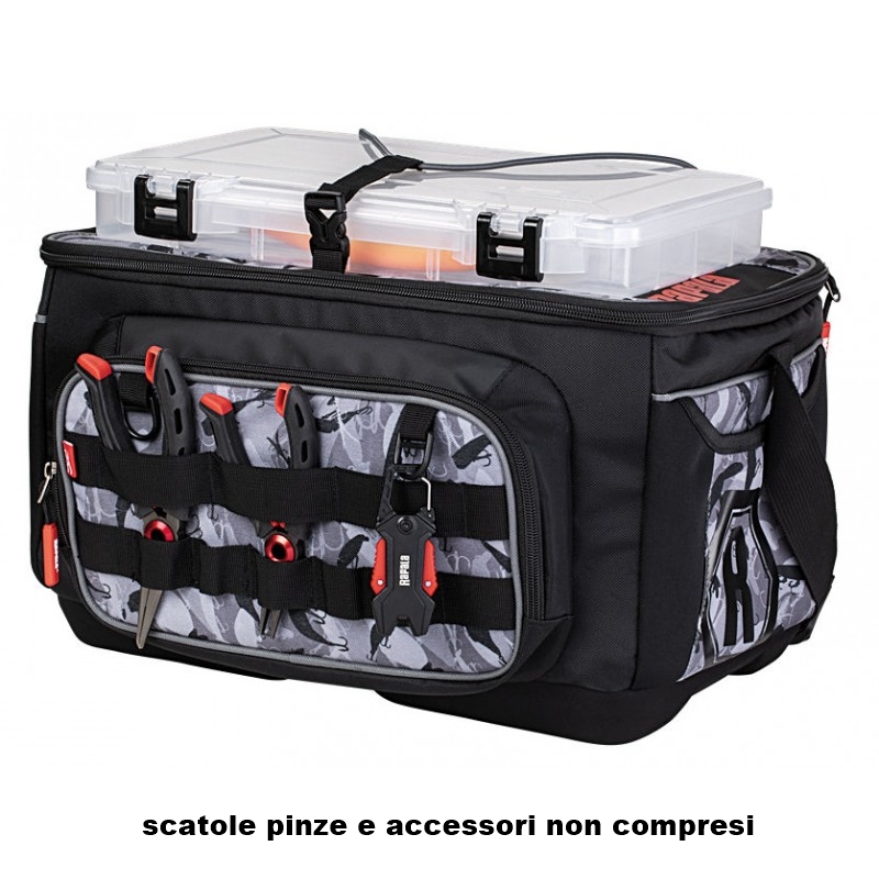 Borsa Rapala con tessuto impermeabile stampato lure-camo, con fondo in EVA modellato e impermeabile. Può ospitare quattro scatole per accessori tipo 3700 all'interno della borsa più una sul coperchio per un rapido accesso. La tasca frontale per un facile acceso agli attrezzi  e numerose tasche. Tasca trasparente con cerniera all'interno del coperchio. Pannelli in neoprene sulle tasche laterali per maggiorie capacità. Tracolla imbottita e regolabile, cerniere YKK, Scatole porta accessori non incluse. 44 x 30 x 25 cm.