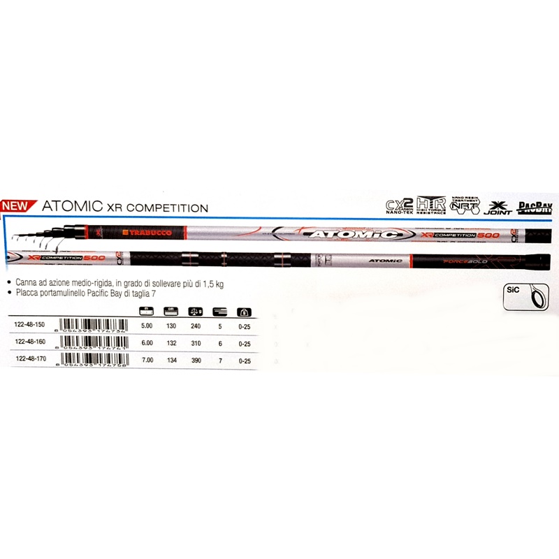 Da tempo le Atomic è sinonimo di forza , dipotenza nel lancio e nel combattimento . Ma non si tratta di energia fuori controllo , perchè ciascuna delle cinque azoni ha un determinato indirizzo di pesca.......A parita' di carico le cinque serie reagiscono in maniera diversa.  Canna di azione Medio Rigida in grado di sollevare piu' di 1,5kg .