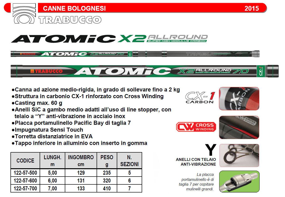 Tramite la X2 si ha il primo contatto con la strepitosa spirale di forza che ha fatto la fortuna del concetto Atomic. Con la capacità di lancio fino a 60 grammi e la forza per sollevare fino a 2 chili di peso, queste canne sono in grado di stupire chi ama le trazioni forti e si attrezza di conseguenza, impiegando terminali di diametro minimo attorno a 0,16-0,18 mm. La sicurezza nasce dalla maglia di carbonio che avvolge a doppia spirale il grezzo in carbonio alto modulo CX1, interrompendosi sulla cima per lasciarle una sufficiente libertà di azione. Una vera camicia di forza che contrasta lovalizzazione del fusto sotto carico e distribuisce gli sforzi lungo le fibre longitudinali del tessuto sottostante. Componenti di qualità completano questi ottimi attrezzi, con porta mulinello Pac Bay di taglia 7 e anelli a ponte medio in SiC, con telaio a Y anti-vibrazione.