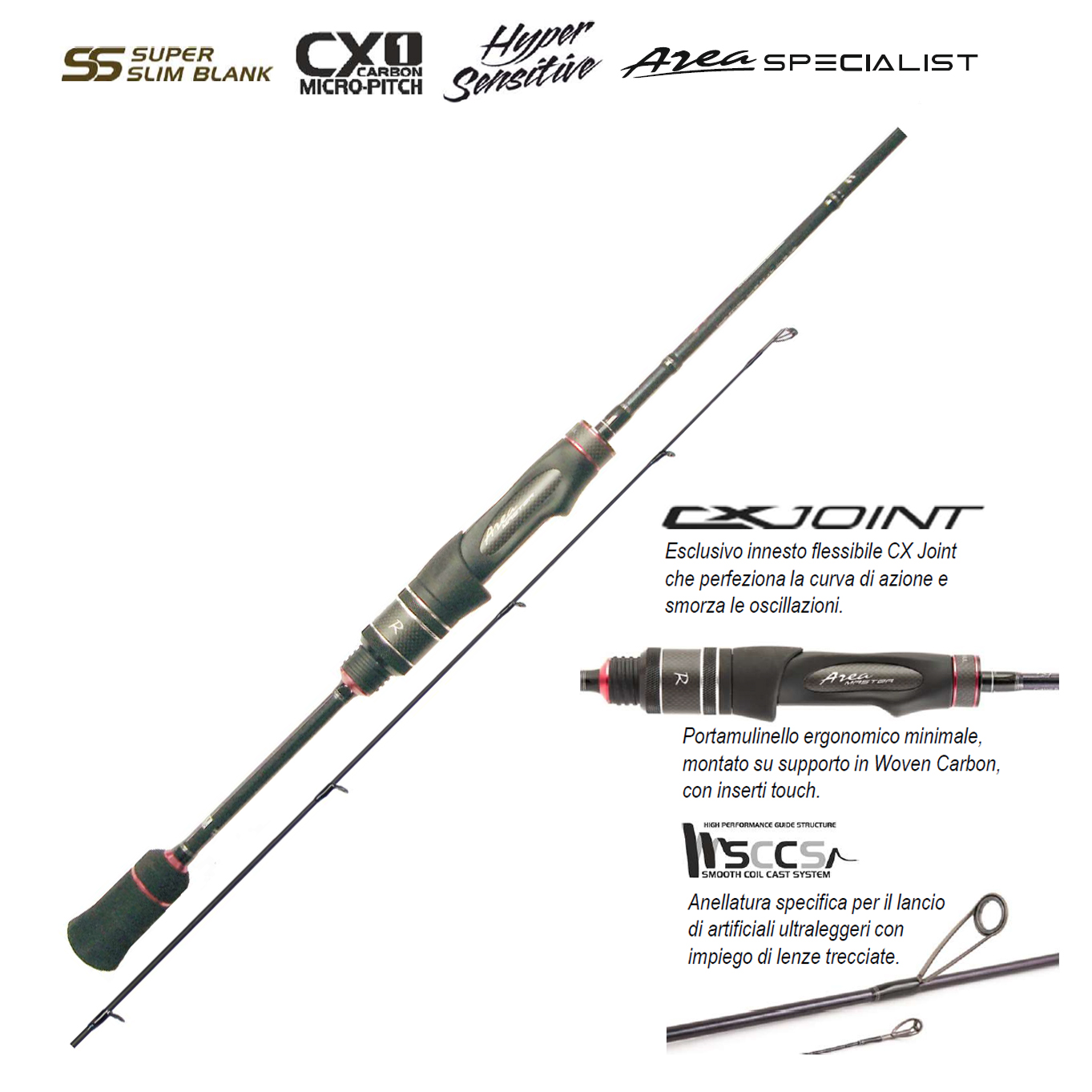 Struttura Super Slim in carbonio CX-1, studiata per lArea Trout Speciale innesto a spigot Xjoint Azione Regular Slow, con fusto rapido e progressivo Speciale vetta tubolare ultra-sensibile, in grado di lanciare esche ultra leggere: spoon, crank e jerk. Calcio corto sdoppiato con grip inferiore in EVa Anelli SiC a gambo lungo con profilo K, perfetti per i trecciati Porta mulinello minimale, montato su segmento in Woven Carbon, con inserti touch.