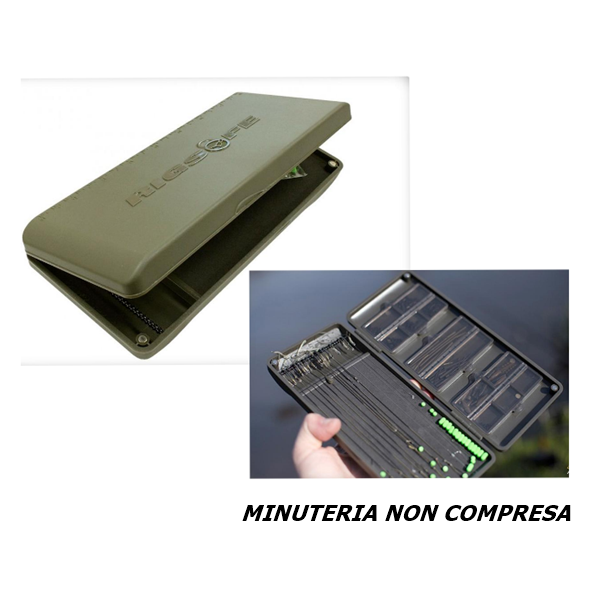 Il sistema di chiusura magnetico assicura che la casetta non possa venire aperta accidentalmente durante il trasporto rimanendo pur semplice da aprire anche in condizioni di bagnato o freddo come un inverno inglese! L’aggancio dei terminali è garantito da una barra di alluminio increspata che evita grovigli mentre sotto di essa, la scatola è leggermente incassata per proteggere le punte dei vostri ami. Il RigSafe è dotato di 20 pin singoli standard e 15 perni doppi che sono stati progettati per garantire il fissaggio dei terminali che non sono ancora stati finiti ( con un cappio o con una girella ) consentendo così di lasciare le regolazioni finali della lunghezza del rig fino a quando non si è sulla postazione di pesca.