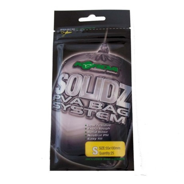 Solidz PVA Bag System realizzati dalla Korda sono dei sacchetti utilizzati per sostituire i Tunnel Web System e sono molto in voga per la pesca ledgering.Questi sacchetti della Korda permettono di far arrivare un insieme compatto di esche alla distanza desiderata in qualsiasi condizione di pesca. I Solidz PVA Bag sono realizzati in pellicola giapponese per offrire la massima affidabilità e prestazioni eccezionali e sono ottima qualità. Ogni confezione è richiudibile e al suo interno è posta una paletta per poter inserire facilmente le esche. Grazie a questi sacchetti della Korda potrete dedicarvi al carpfishing e attirare facilmente tutte le carpe che si aggirano nei dintorni al vostro amo. Con i Solidz PVA Bag System Korda non potete sbagliare e sarete certi di affidarvi a un prodotto di assoluta qualità e affidabilità.  Disponibili in ben 4 taglie (XS, S, M, L), i Solidz PVA Bag System sono molto utilizzati nel tecnica di pesca del carpfishing.