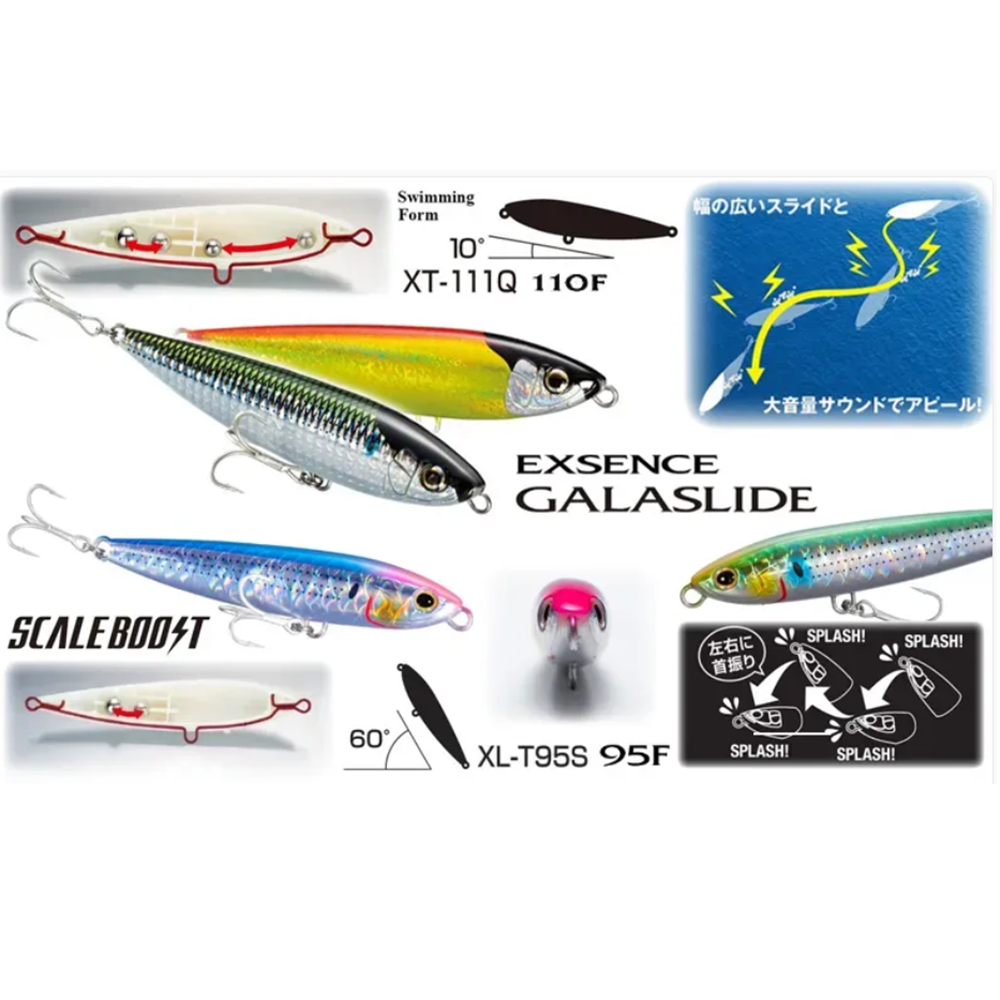 L'Exsence Galaslide è un'esca galleggiante di medie dimensioni progettata per le spigole e i predatori che si nutrono in superficie. Ha un'azione aggressiva "walk the dog" che può essere fatta schizzare quando viene recuperata con un movimento di stop-start. La tecnologia Scale Boost aumenta l'attrazione visiva, soprattutto in acque limpide, mentre un forte rattle crea vibrazioni e rumore.