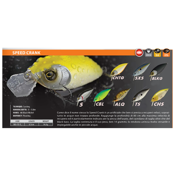 Come dice il nome stesso lo Speed Crank è un artificiale che ben si presta a recuperi veloci, soprattutto in acque non troppo profonde. Raggiunge la profondità di 80 cm alla massima velocità di recupero ed è particolarmente indicato per la pesca dell’aspio, del cavedano di taglia oltre che del black bass. La taglia contenuta e il suo peso, ben 14 grammi, lo rendono un’esca molto versatile e impiegabile anche in piccole acque.