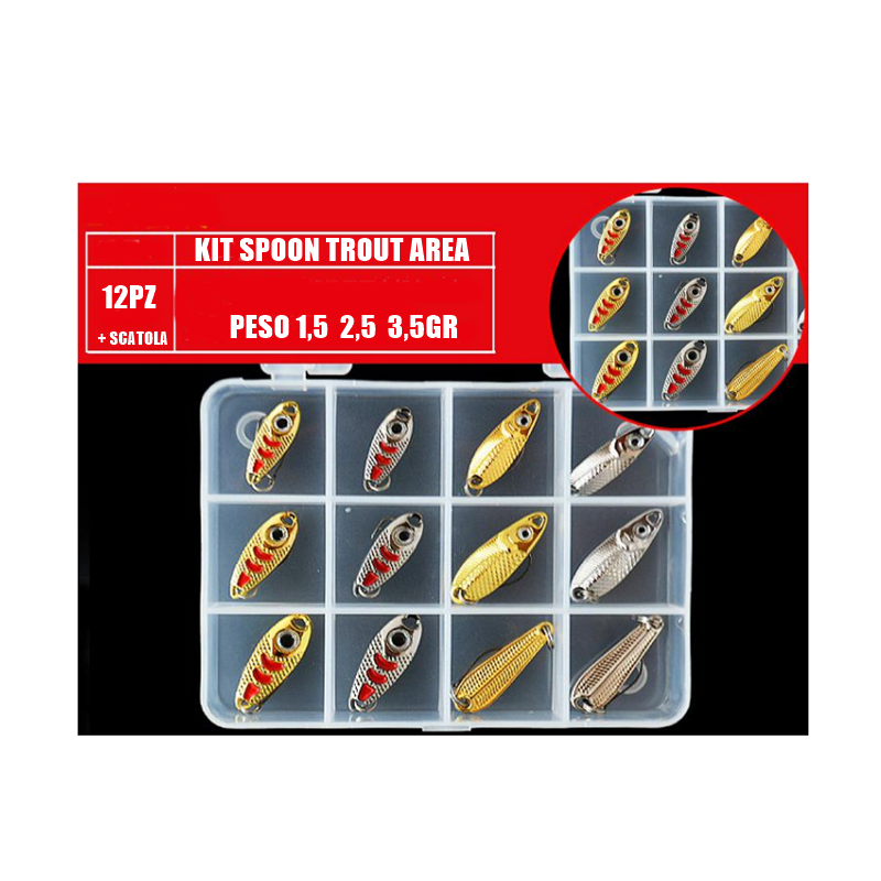 Per la pesca alla trota e' stato creato questo KIT di cucchiaini ondulante ultra leggero. Il movimento delicato, insieme alle colorazioni molto brillanti, sono i punti di forza di un'esca molto catturante in lago. L'armatura e' costituita da un amo singolo,
