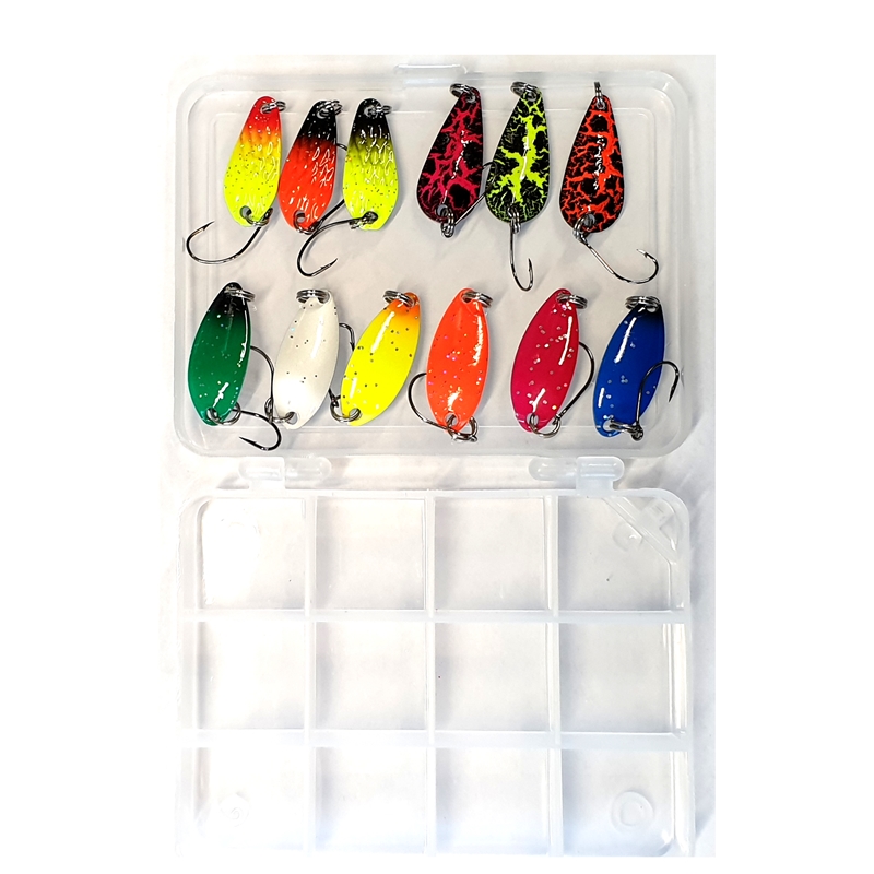 Per la pesca alla trota e' stato creato questo KIT di cucchiaini ondulante ultra leggero. Il movimento delicato, insieme alle colorazioni molto brillanti, sono i punti di forza di un'esca molto catturante in lago. L'armatura e' costituita da un amo singolo,