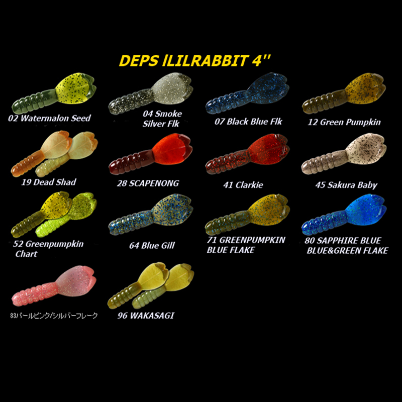 DEPS LILRABBIT  Il Lil Rabbit è stato sviluppato concentrandosi per la cattura dei grossi bass che si annidano negli stagni, anse di fiumi o laghi, è composto da un corpo compatto piatto ed "ingombrante" che il bass preferisce. Le vibrazioni che emette danno alla preda una sensazione di vitalità unica, l'esca è creata da un blocco unico di una speciale gomma di grosso spessore.  Il Lil Rabbit è inoltre imbevuto per il 20% di sale e odori (aglio e gamberetti) che lo rendono ancor più attirante.  Deps Lilrabbit 4" possiamo dire con nessuna possibilità di smentita che si tratta di una grande esca di questa grande casa giapponese, Innescato a texas, carolina e a drop shot ha dato ottimi risultati.  La particolare forma lo rende unico anche nel movimento, infatti la coda muove una grande quantità d'acqua, stimolando i bass, veramente consigliata.  Lunghezza 4" - 10,2 cm     ----     6 per confezione