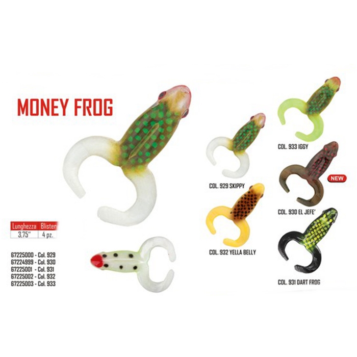 Con lo stesso atteggiamento del Craw Money, Money YUM è la nuova rana dalle caratteristiche simili..... Mentre fornisce versatilità totalmente nuova. Il nuovo YUM Money Money Frog ha le caratteristiche "del paddle" piedi che producono uno spostamento d'acqua e vibrazioni incredibili , e può essere pescato in una varietà di modi - ronzava in superficie come un buzzbait; svegliato appena sotto la superficie; Texas truccate e capovolto e si accamparono a spessa copertura modelli altamente dettagliati rana sono il risultato del processo singolarmente dipinta a mano, e l'esca è evidenziato da esclusivo occhi 3-D rossa. Dispone anche di slot unico ventre che permette manovre dritte e una migliore collegamento rapporto perché non c'è molto di plastica per penetrare prima di colpire i pesci. Lunghezza 3,75'' ----- 4 pezzi per busta