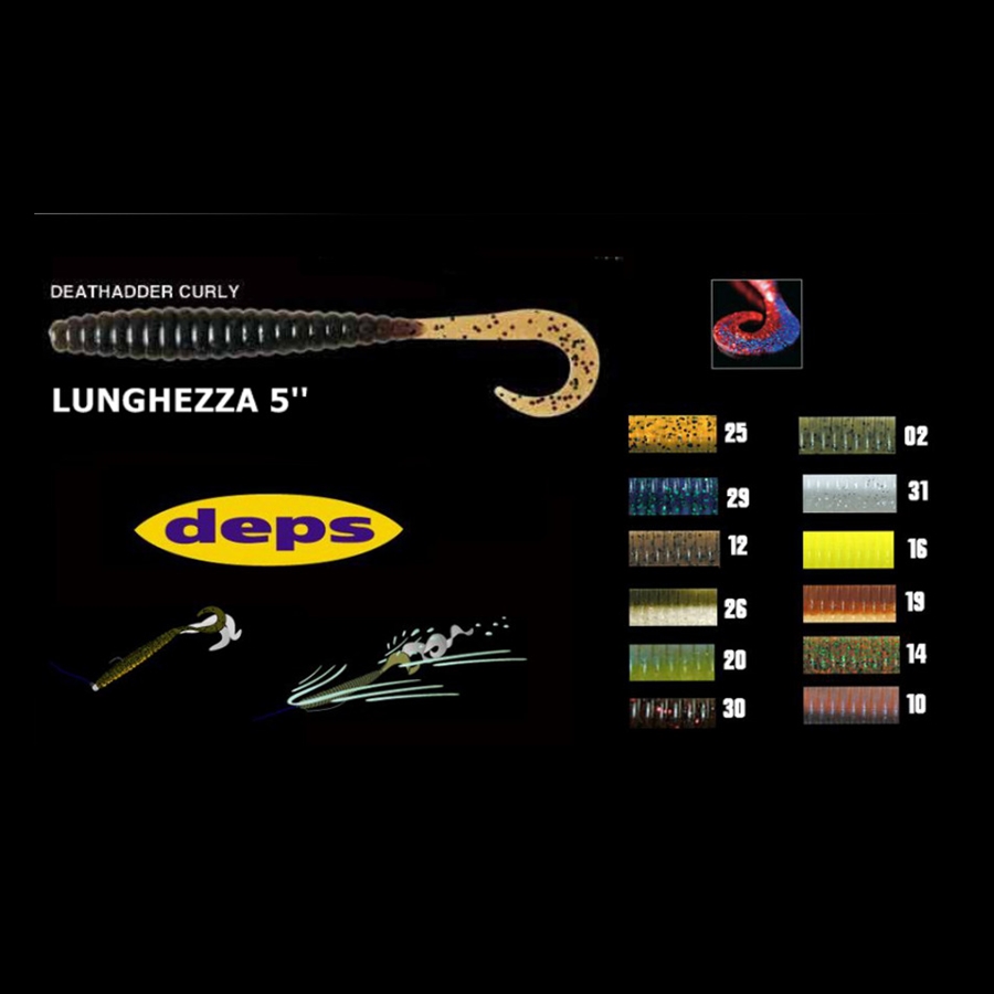 Poco dopo la messa sul mercato dei Deps Deathadder Grub & Deps Deathadder Curly ci sono subito pervenute notizie di numerose catture di grossi bass. Il notevole spessore della coda crea vibrazioni ad alta frequenza e il corpo di tipo shad si prestano perfettamente alla ricerca dei bass abituati alla rigidità dei grub convenzionali. Queste esche si prestano per un utilizzo senza piombo, come fossero dei buzzbait recuperati a galla, ma anche innescati Texas Rig per sondare gli erbai più fitti, ed anche come trailer sui vostri jig. Ma labbinamento del Deps Deathadder Grub con la nostra SwimmingJigHead e del Deps Deathadder Curly con la R.R. JigHead si è rivelato letale nella rapida ricerca dei big bass, in alternativa al classico spinnerbait
