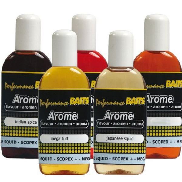 Si tratta di una delle migliori e più ampie gamme di aromi esistenti sul mercato. Sono realizzati con una combinazione di solventi che permette loro di dissolversi nell'acqua immediatente e in modo persistente, indipendentemente dalla temperatura dell'acqua stessa. Consente di realizzare boilies con aroma e gusto davvero marcati. Confezionati in bottigliette da 75 ml, prevedono un dosaggio di 3/4 ml per 500 g di mix.