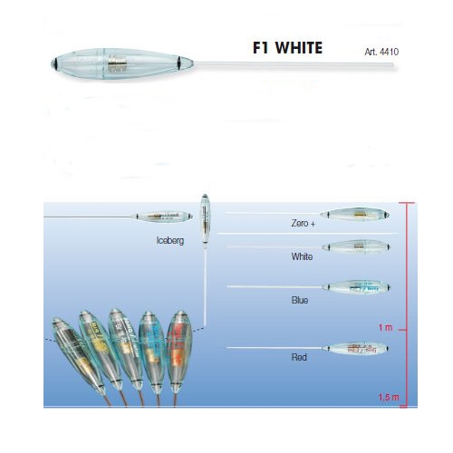 La caratteristica principale delle bombarde F1 è quella di avere un corpo in plastica trasparente ottenuto da stampo che, diversamente da un corpo in legno di balsa tornito, garantisce nel tempo il massimo della precisione dei parametri di peso e di galleggiabilità. Una precisione tale da permettere la realizzazione dei modelli White, Zero + e Iceberg che, avendo un grado di Affondamento prossimo al confine fra il galleggiare e laffondare, sono facili da sbagliare in una produzione di massa. F1 WHITE Utilizzo: avendo lF1 White un grado di affondamento (G.) compreso fra 0,50 e 1,00 grammi è ideale per pescare a pelo dacqua o al massimo un metro sotto con recupero tremarellato molto lento. Terminali lunghissimi sono da preferire, in ogni caso non meno di 2 metri e comunque sempre in fluoro carbon sottile dello 0,12-0,14 mm. con leccezione del diametro 0,16 quando cè una buona continuità di catture.