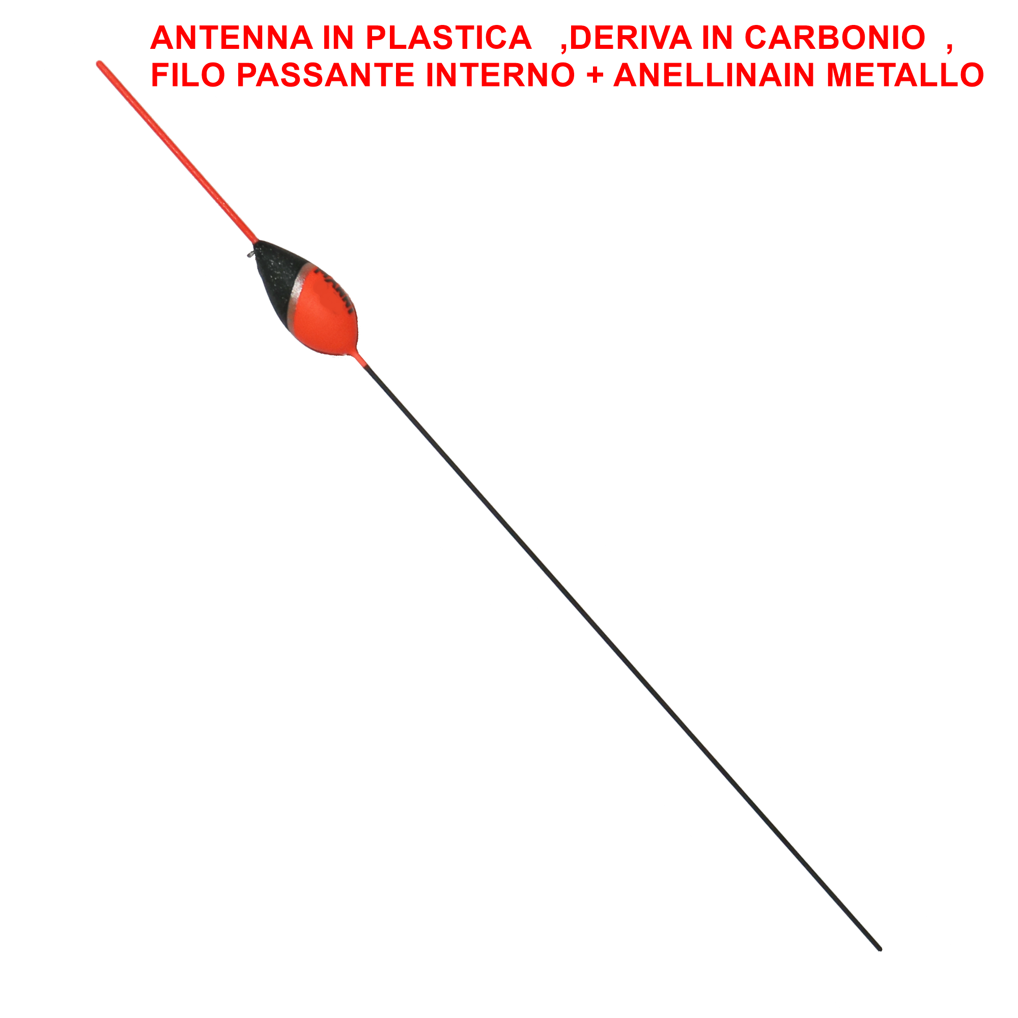 Galleggiante con filo passante interno e occhiello in metallo annesso.......Diametri antenna e deriva  Medio Fini . Lunghezza Maggiorata .