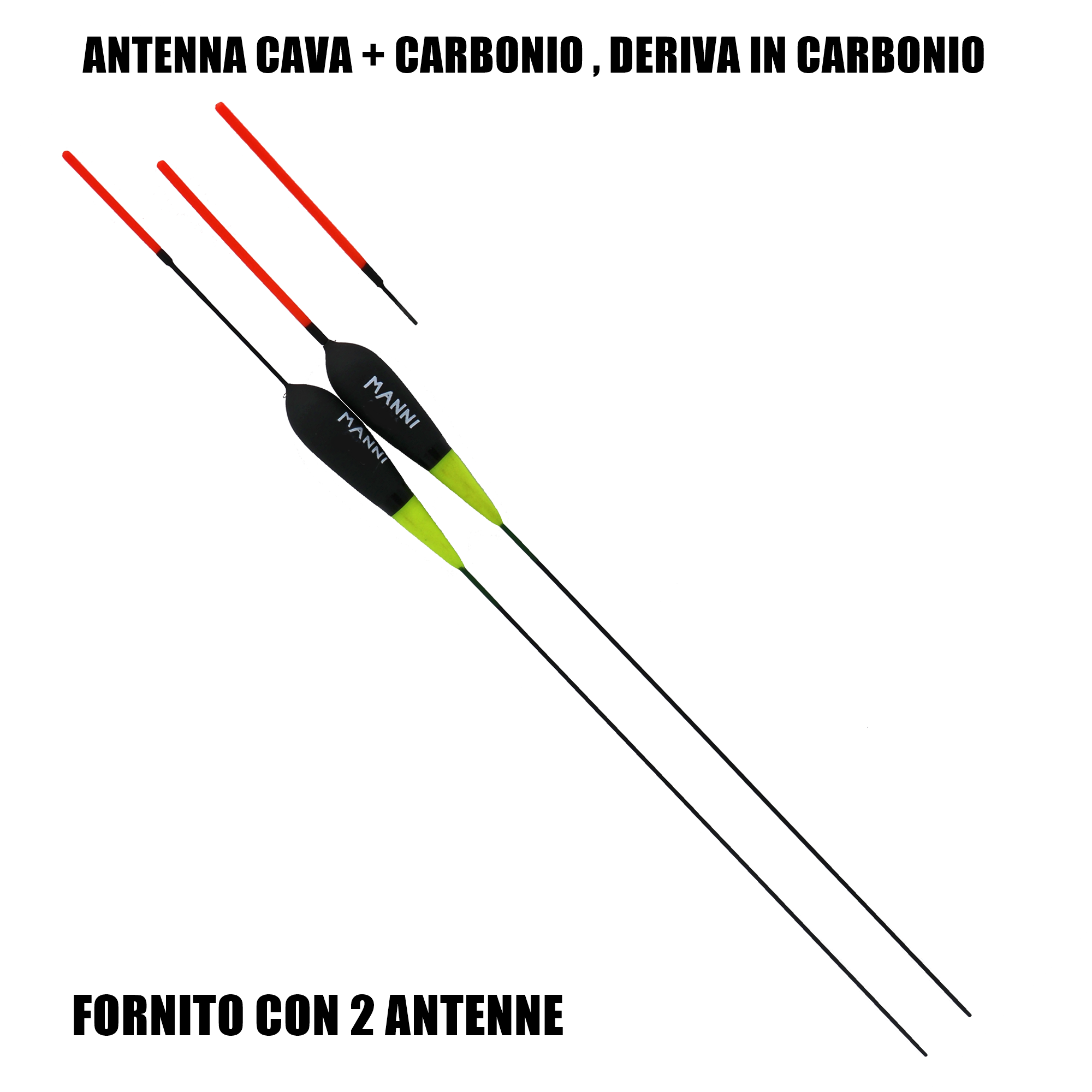 Galleggiante COMO Manni, deriva in carbonio e antenna intercambiabile, fornito di 2 antenne, una con carbonio lungo per pescare fuori punta  e una di lunghezza classica. Galleggiante Technico e raffinato.