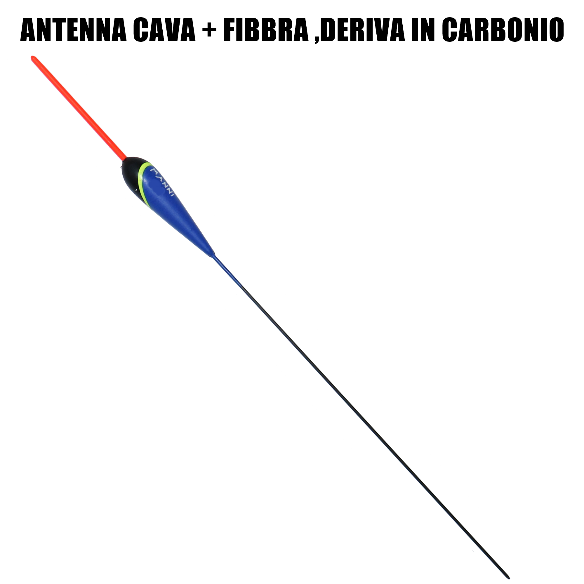 Galleggiante di pregevole fattura di dimensioni medie per antenna e deriva. Specifico da laghetto, si adatta alla perfezione per la pesca in canale e/o fiumi ad acqua lentissima o in laghetto.  antenna  ad altissima visibilità (fibra inserita in asta cava) e deriva in carbonio.