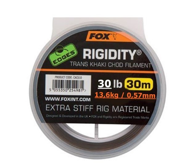 Caratteristiche: Versione migliorata del Rigidity originale; Caratterizzato da una colorazione mimetica Trans Khaki per una bassa visibilità; Filamento Chod più rigido di sempre; Visibilità ridotta in acqua; Perfetto per rig Chod e Hinged Stiff; La sua natura rigida lo rende molto difficile da espellere per le carpe una volta che lesca è stata ingoiata; I nodi in stile whipping consigliano lutilizzo della versione da 30lb; Fornito in bobine da 30 metri.