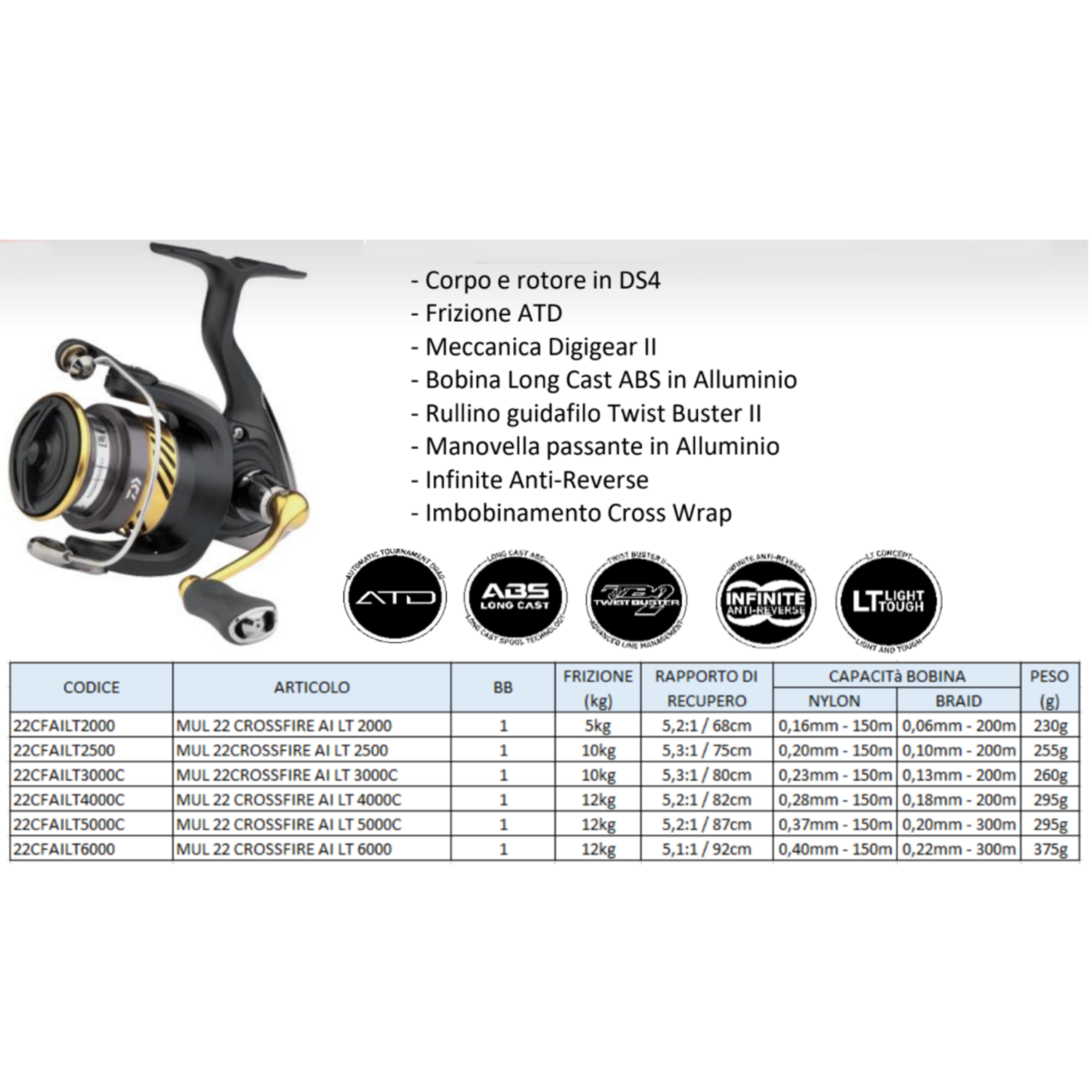 Il Crossfire LT della Daiwa rappresenta la prima fascia della nuova serie di mulinelli LT. Di questo nuovo mulinello convince il design moderno combinato con un'eccellente qualità Daiwa, ma soprattutto un incredibile rapporto qualità-prezzo, mai visto prima! Grazie al concetto LT, è possibile ridurre il peso dei mulinelli seppur mantenendo la stessa grandezza e potenza. La bobina in alluminio "ABS Longcast" produce meno attrito con il filo e ottimizza le prestazioni di lancio. Il "Tough Digigear" offre un recupero fluido ed anche grande potenza.