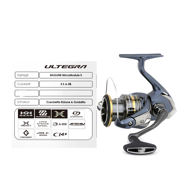 Il nuovo Ultegra è dotato di caratteristiche e tecnologie allavanguardia. Ha resistenza, durata e prestazioni operative impareggiabili ad un prezzo veramente interessante. Rotazione fluida: Silent Drive & Micromodule Gear II Resistenza e durata: HAGANE Gear & X Protect Performance di lancio: Long Stroke Spool INGRANAGGI HAGANE MICRO MODULE II , Cuscinetti 5 S-ARB , (ATTENZIONE PERCHè QUESTO MODELLO HA ALCUNE COMPONENTI CI4 ). Cuscinetto Frizione e guidafilo X-PROTECT