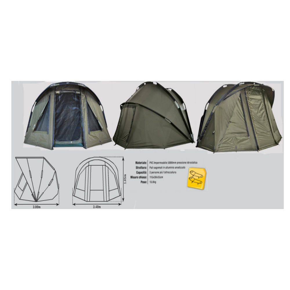 Anche questanno il K-Karp Team ha studiato una tenda dedicata al carpista estremo, frutto dellesperienze maturate sul campo dalla precedente versione e grazie a un mix di idee condivise sia dal Team Italiano che da altri vertici provenienti dai Team K-Karp europei. Siamo giunti di conseguenza alla creazione di una tenda a tre strati, che virtualmente possiede un livello di coibentazione unico nella sua gamma. La struttura è formata da una forte paleria in alluminio che sorregge il telo impermeabile mentre allinterno è presente una camera isolata munita di pavimento incorporato e non asportabile per evitare lingresso di ospiti indesiderati, questa camera vi cautelerà in oltre dalla formazione di condensa tipica delle tende mono-telo o bivvy. Oltre al fondo incorporato della camera interna in resistente PE, è fornito come standard anche il PVC Groundsheet, un ulteriore telo di pavimentazione impermeabile e anti-strappo, ideale per terreni accidentati e per incrementare la barriera allumidità del terreno. La parte posteriore della tenda trova una finestra dareazione munita di zanzariera, accessibile anche dallinterno, per favorire il ricircolo daria necessario nella stagione calda dellanno. E possibile rivestirla con unulteriore telo esterno, il Third Skin, ideale per affrontare le sessioni invernali più estreme limitando lumidità interna e aumentando la coibentazione. Le dimensioni generose dellAttraction Dome permettono lalloggiamento di due lettini più lattrezzatura ed è venduta completa di PVC Groundsheet, pali di tensionamento, picchetti per lancoraggio e sacca di trasporto. Mentre il Third Skin è disponibile separatamente.